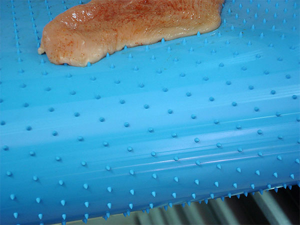 | 卓越耐用易维护 | 1. 耐切割与耐磨:在肉骨切割等高冲击环境下不易龟裂、磨损,寿命远超普通输送带。 2. 易清洁消毒:表面光滑不粘连,对常用清洗剂和高温消毒具有优异的耐化学腐蚀和耐水解性,可大幅缩短清洁时间,减少用水和化学品消耗。 | 减少停机清洗时间,提高设备综合利用率(OEE),降低长期耗材成本。 |